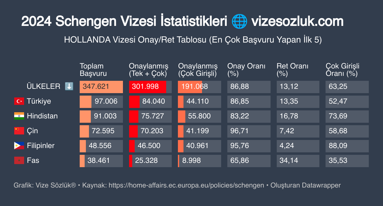 Hollanda’ya yapılan Schengen vizesi başvurularının ilk 5 sıralamasındaki ülkeler arasında “onay oranı” en düşük ülke %65,86 ile Fas olurken, Filipinler ise %4,24 ile “ret oranı” en düşük ülke olarak hemen göze çarpıyor.