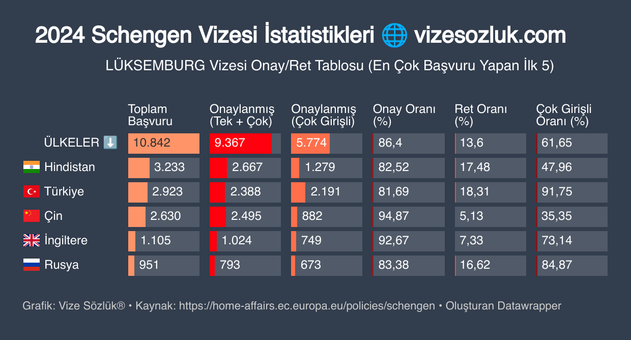 Lüksemburg’a yapılan Schengen vizesi başvurularının ilk 5 sıralamasındaki ülkeler arasında “onay oranı” en düşük ülke %81,69 ile Türkiye olurken, Çin ise %5,13 ile “ret oranı” en düşük ülke olarak hemen göze çarpıyor.