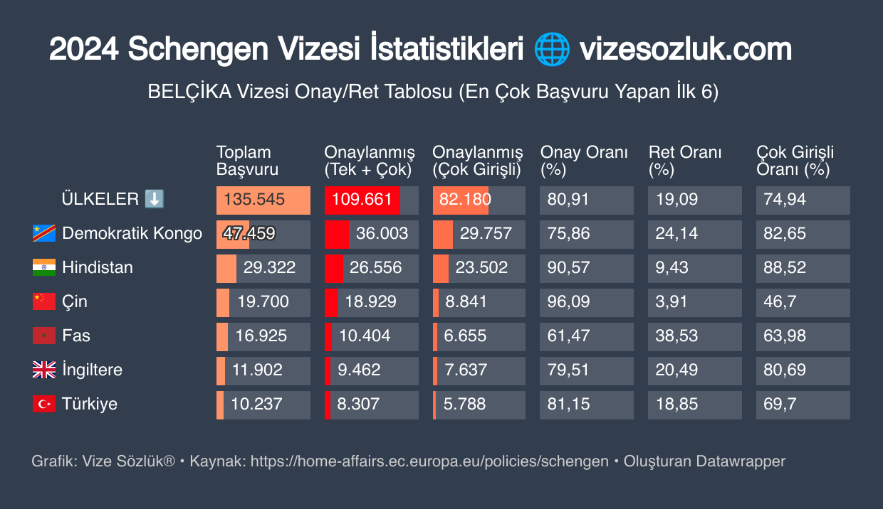 Belçika’ya yapılan Schengen vizesi başvurularının ilk 6 sıralamasındaki ülkeler arasında “onay oranı” en düşük ülke %61,47 ile Fas olurken, Çin ise %3,91 ile “ret oranı” en düşük ülke olarak hemen göze çarpıyor.