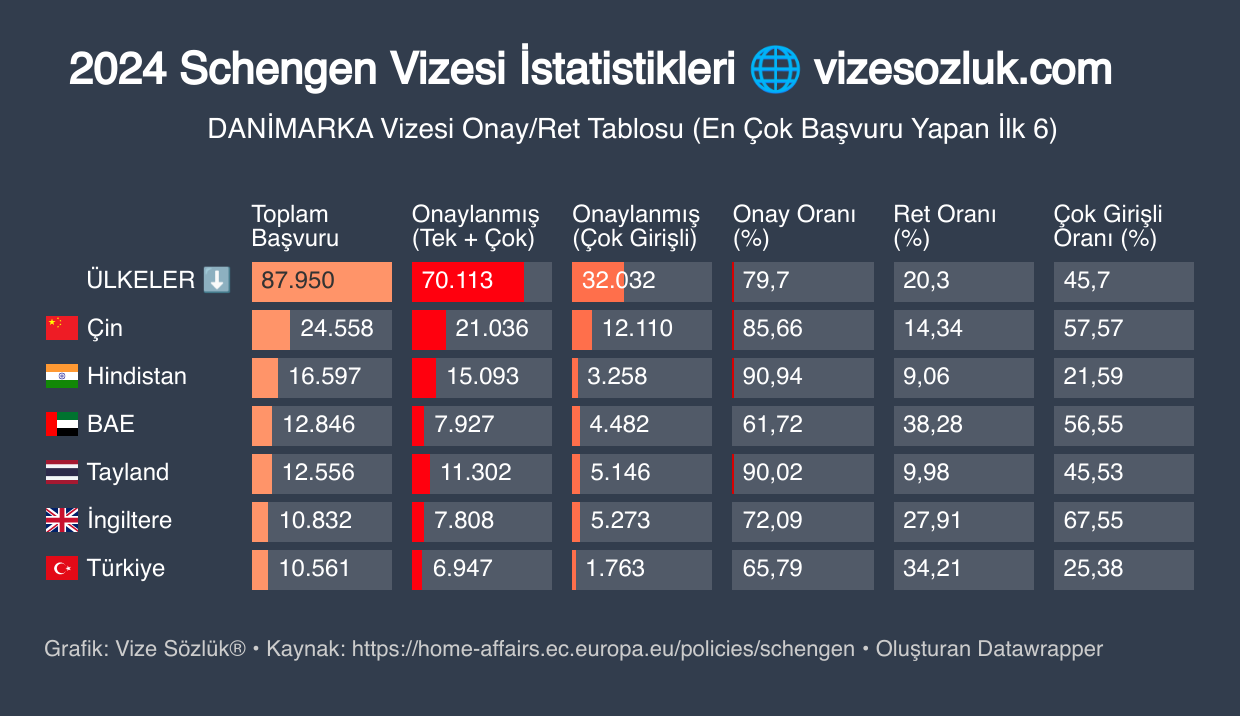 Danimarka’ya yapılan Schengen vizesi başvurularının ilk 5 sıralamasındaki ülkeler arasında “onay oranı” en düşük ülke %61,72 ile BAE olurken, Hindistan ise %9,06 ile “ret oranı” en düşük ülke olarak hemen göze çarpıyor.