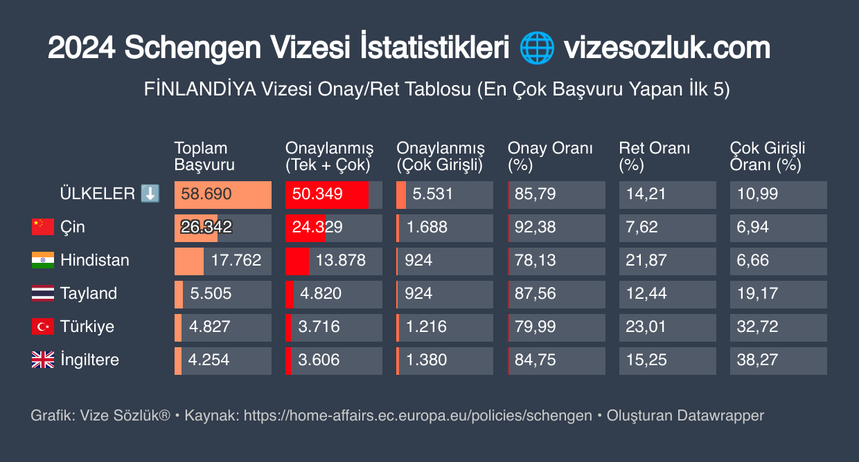 Finlandiya’ya yapılan Schengen vizesi başvurularının ilk 5 sıralamasındaki ülkeler arasında “onay oranı” en düşük ülke %78,13 ile Hindistan olurken, Çin ise %7,62 ile “ret oranı” en düşük ülke olarak hemen göze çarpıyor.
