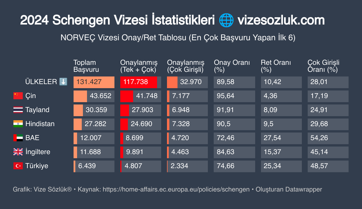Norveç’e yapılan Schengen vizesi başvurularının ilk 5 sıralamasındaki ülkeler arasında “onay oranı” en düşük ülke %72,46 ile BAE olurken, Çin ise %4,36 ile “ret oranı” en düşük ülke olarak hemen göze çarpıyor.