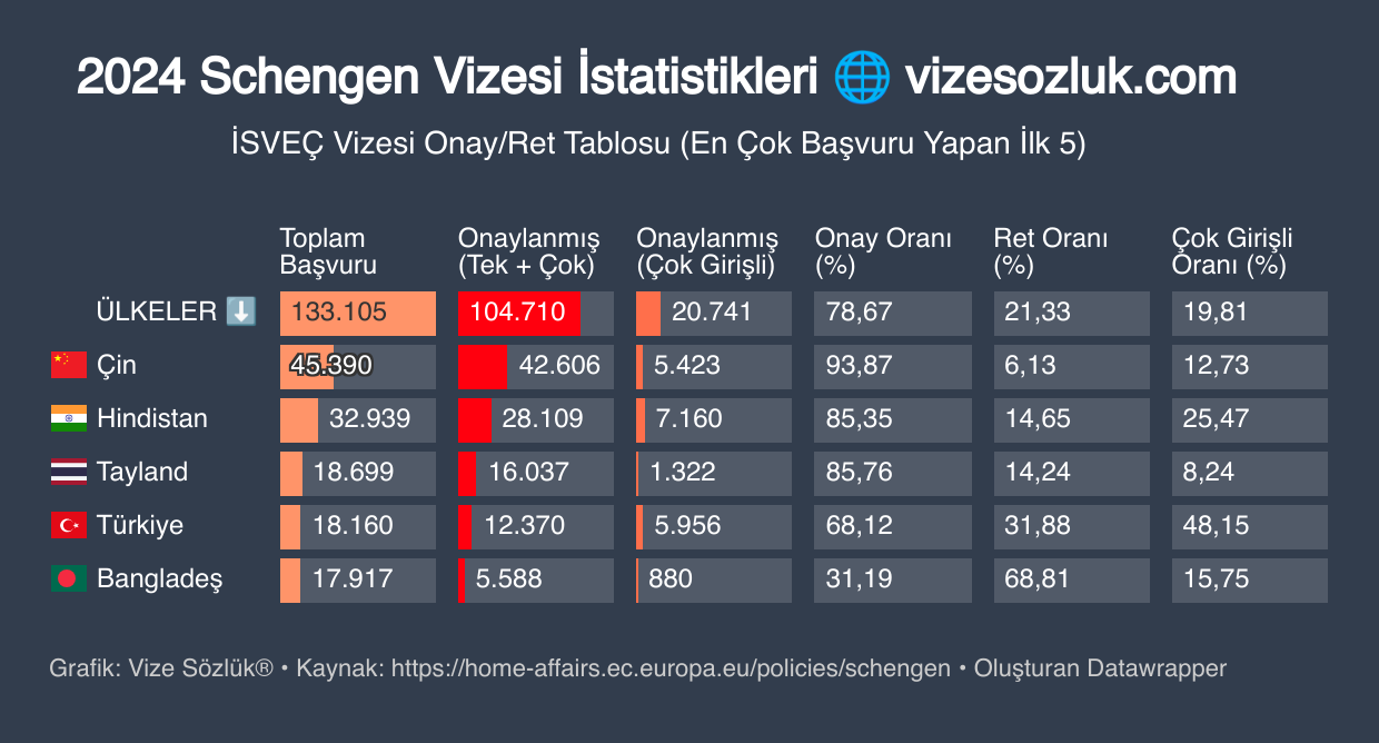 İsveç’e yapılan Schengen vizesi başvurularının ilk 5 sıralamasındaki ülkeler arasında “onay oranı” en düşük ülke %31,19 ile Bangladeş olurken, Çin ise %6,13 ile “ret oranı” en düşük ülke olarak hemen göze çarpıyor.
